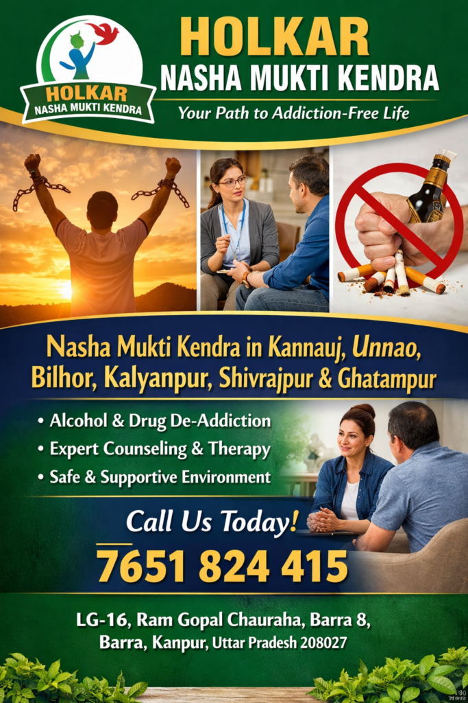 Holkar Nasha Mukti Kendra is dedicated to helping individuals from Kannauj, Unnao, Bilhor, Kalyanpur, Shivrajpur, Ghatampur, and surrounding areas begin a fresh, addiction-free life. With experienced counselors, structured recovery programs, and compassionate care, the center focuses on long-term healing rather than temporary solutions.
